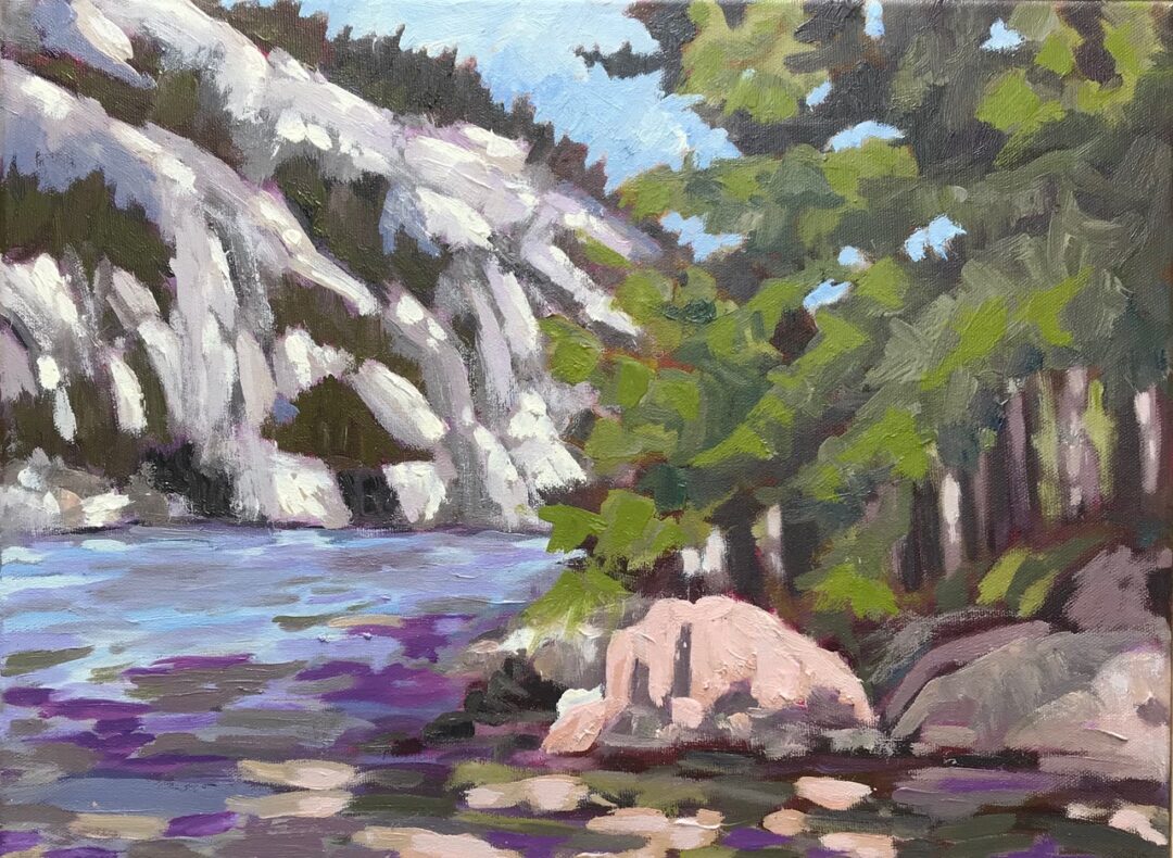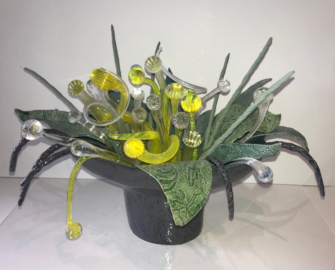 “An eclectic interpretation of Journeys, Dreams and Fantasies. Modern abstract paintings that stimulate thought and discovery, bold impressionistic landscapes that respond playfully to light, and ceramic and glass designs with free flowing form and colours capturing whimsy.”