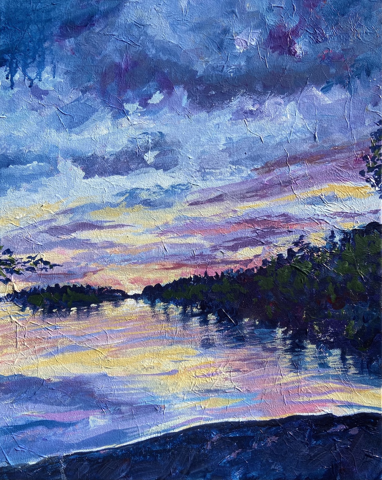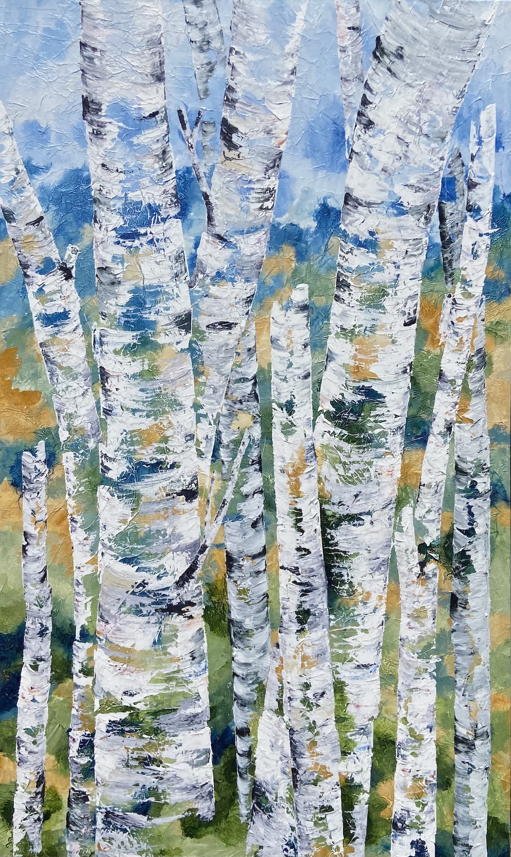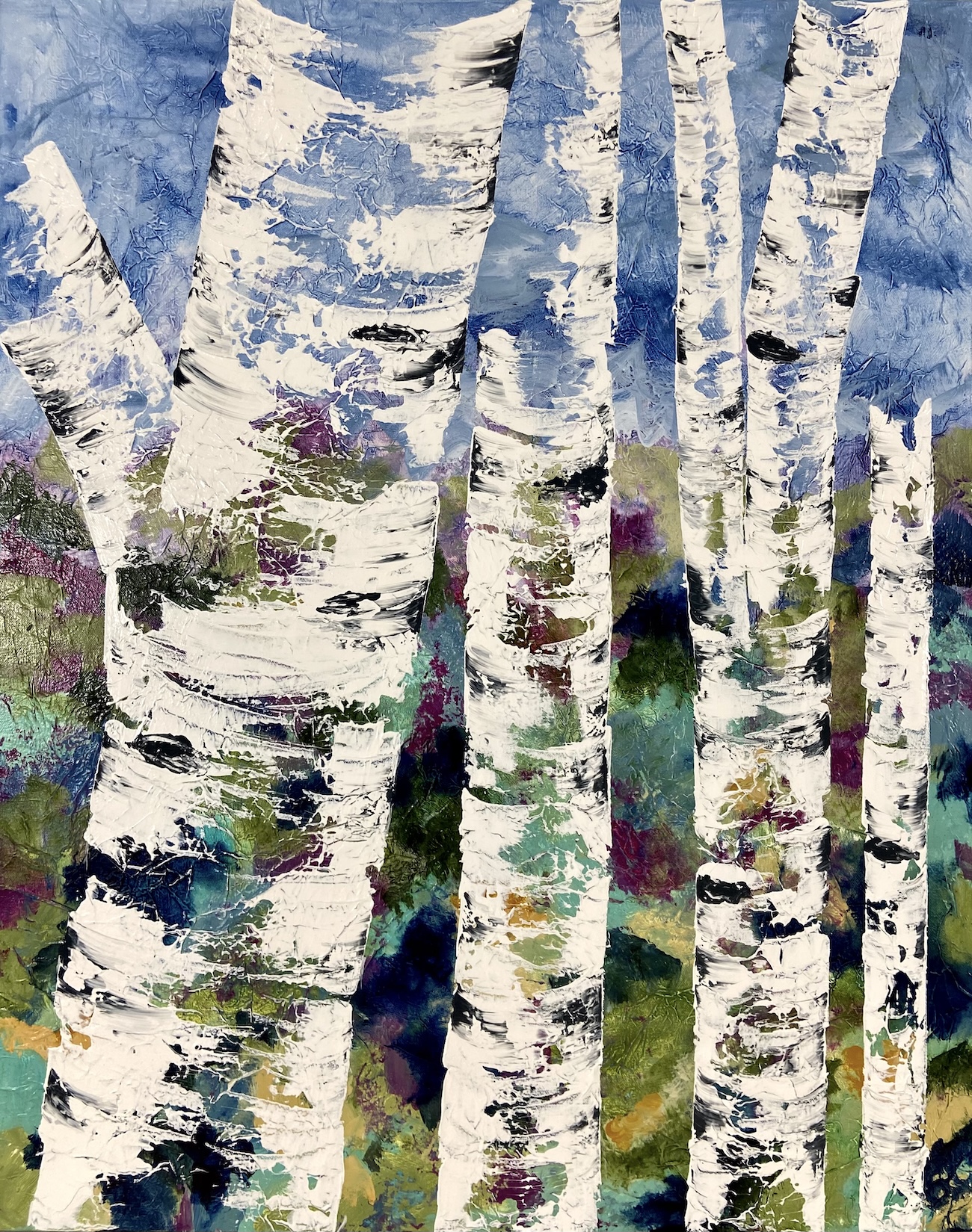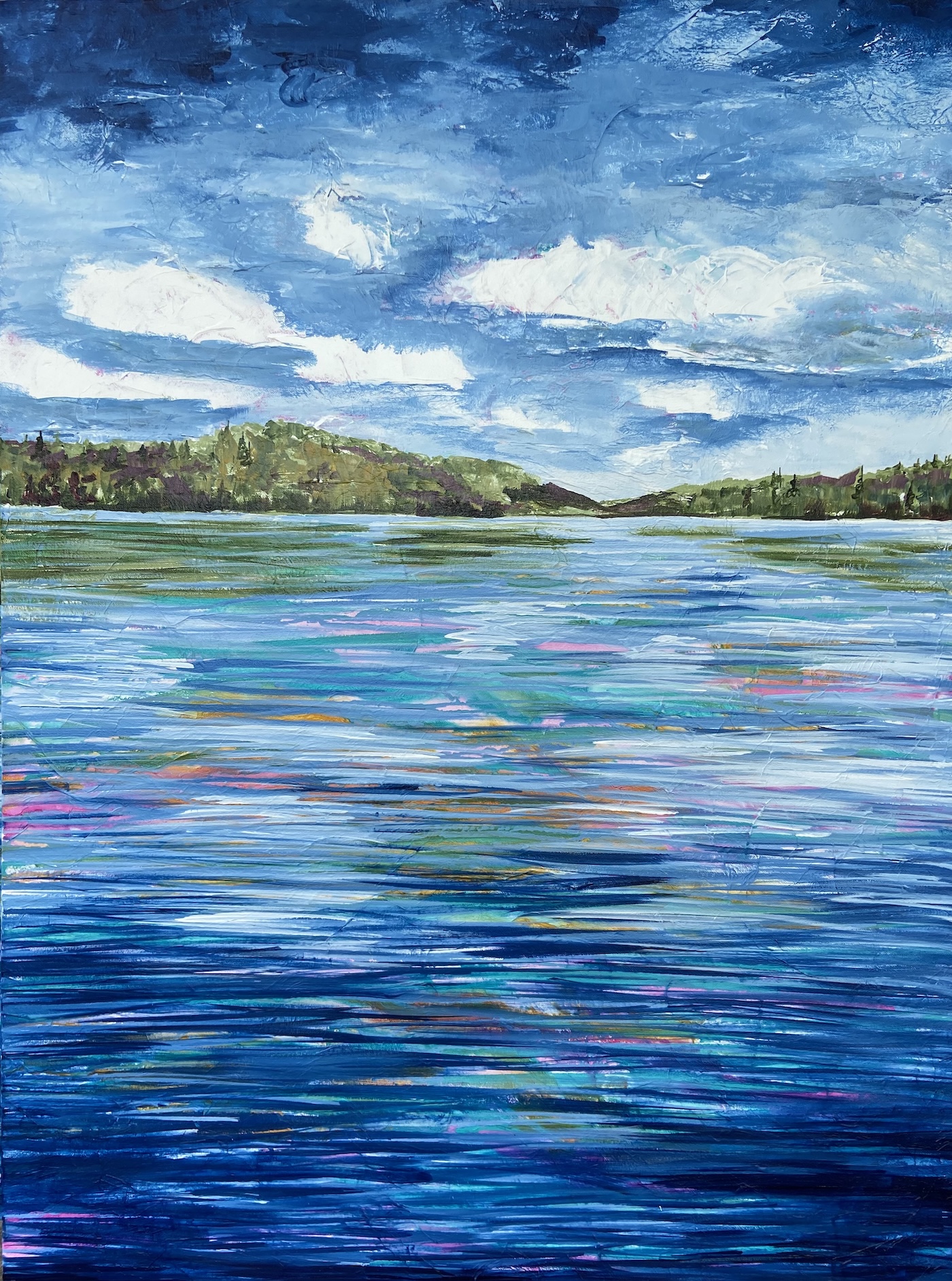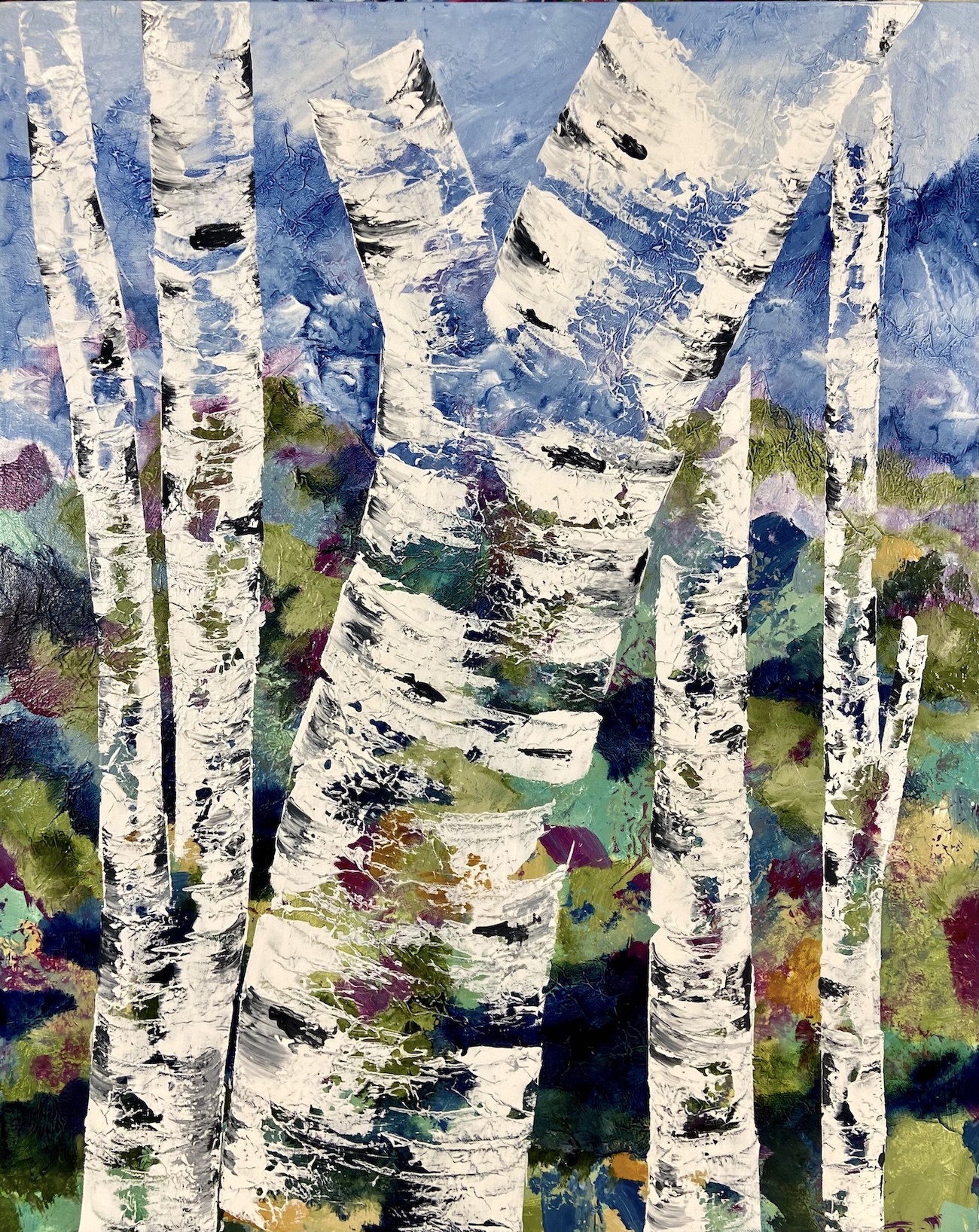 Kareen’s art captures the essence of realism with an impressionistic touch. She covers her canvas with paper and mediums creating an unexpected textural surface to capture the many layers of colour. “ I draw inspiration from the graceful lines of birch trees, our many lakes, the charm of field flowers, and the vastness of roadside landscapes”, says Kareen from Markham.