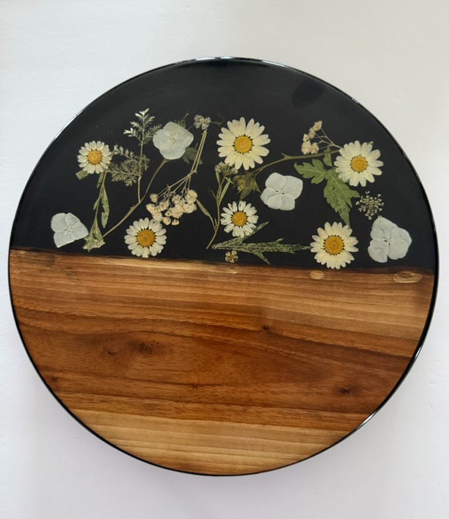 George McCart – Center Piece “Lazy Susan” – Black Walnut with Daisies in Epoxy – 12 diameter