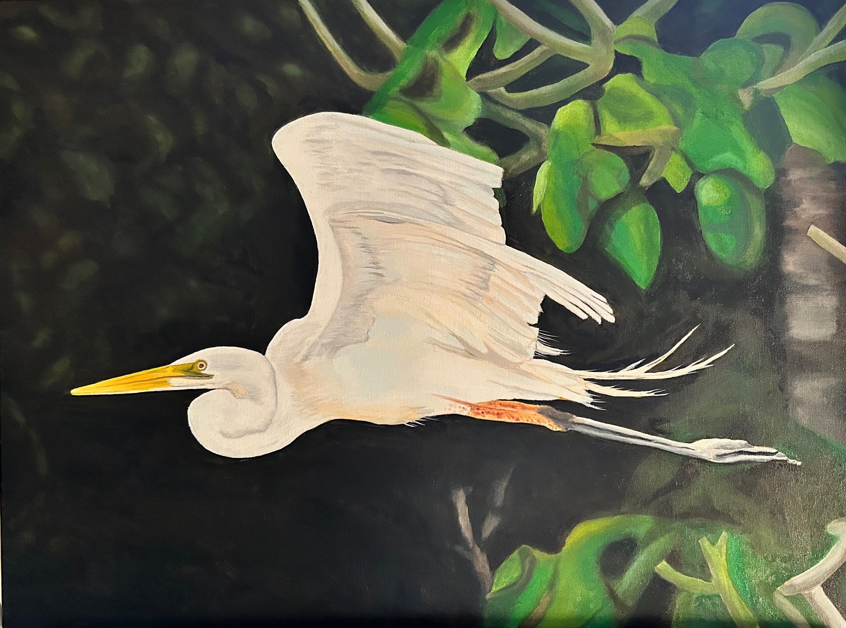 / Marj Gegear – Great Egret, In Flight – Oil on Canvas – 18×24